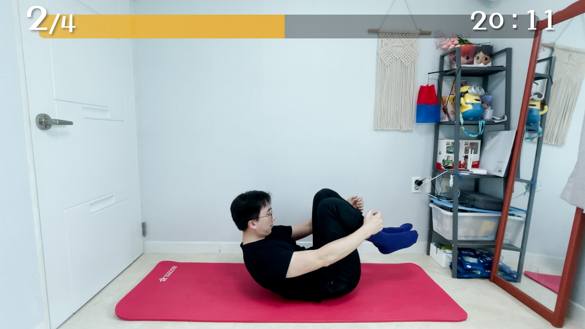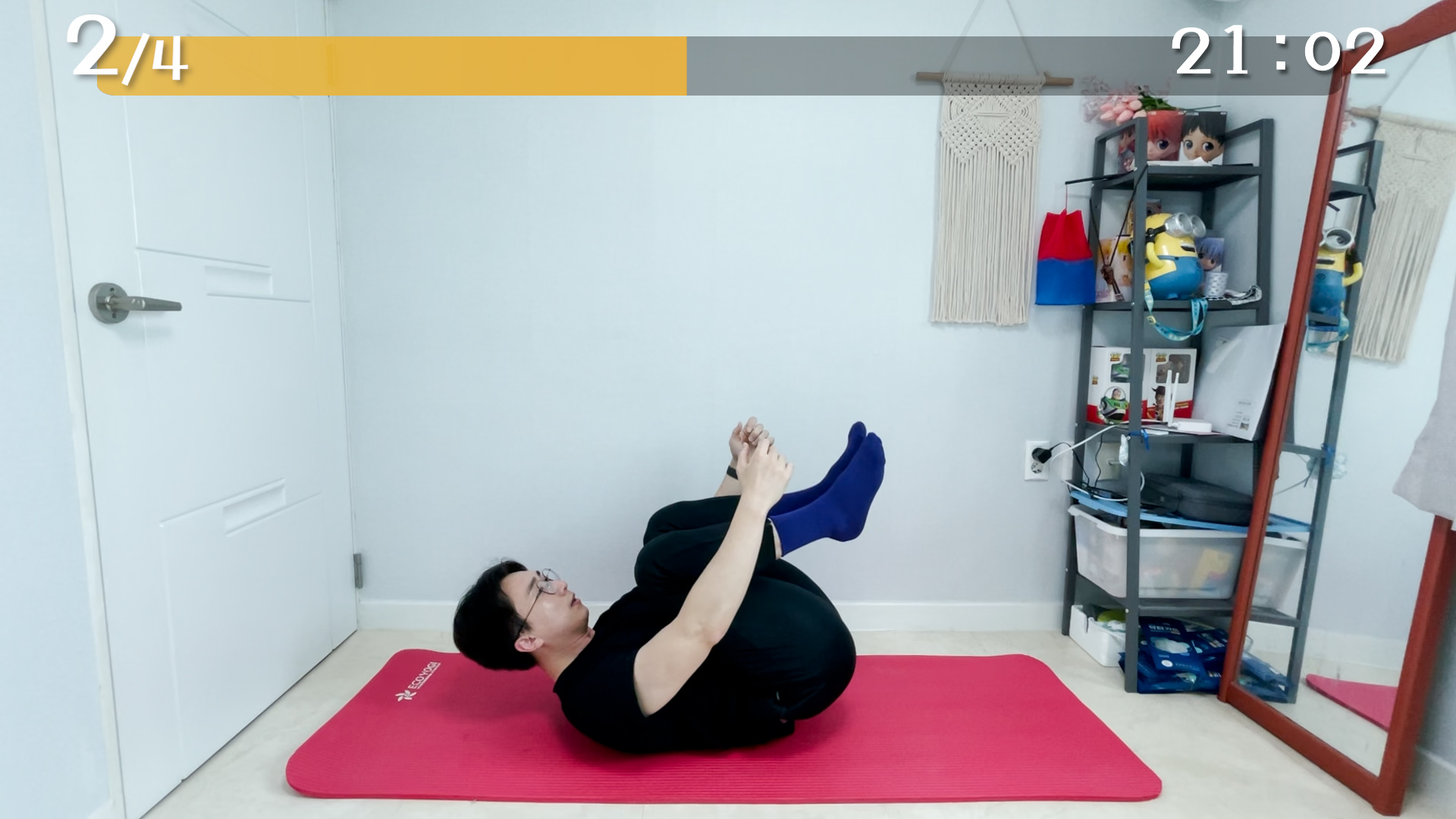 무릎을 가슴쪽으로 당겨주시고, 어깨를 바닥에서 들어준다는 느낌으로 몸을 말아줍니다.